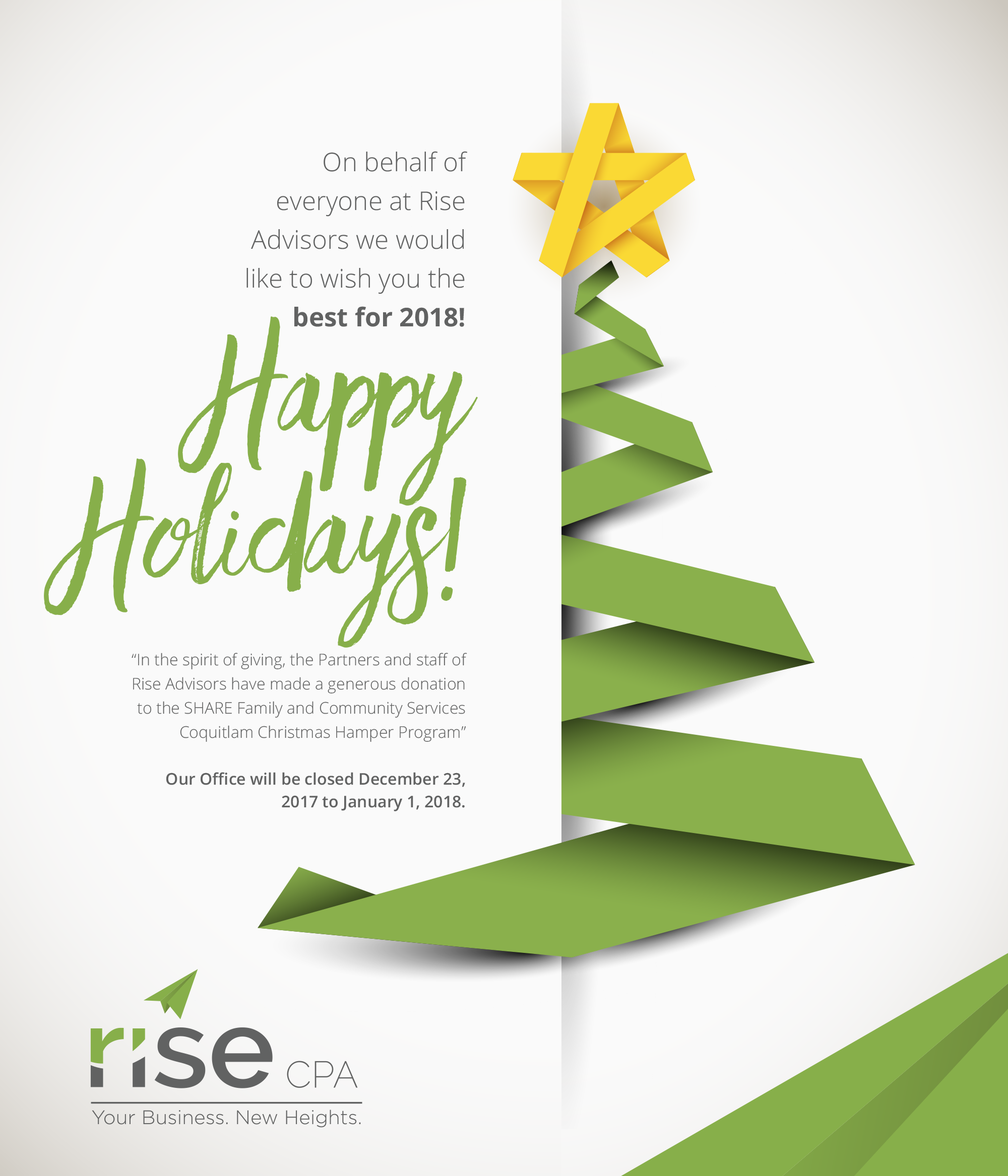 On behalf of everyone at Rise Advisors we would like to wish you the best for 2018!